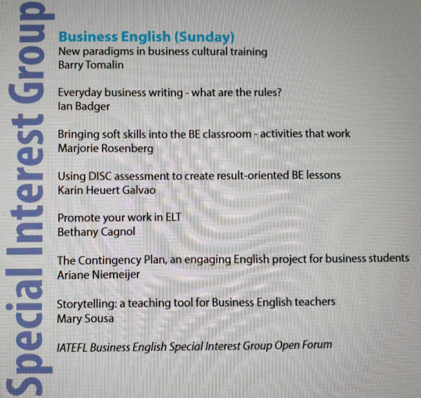 | April 19th 2020 should have been the day that Ian Badger would be discussing 'rules' in current business writing. Sadly because of the covid-19 pandemic, the conference has been cancelled and all scheduled talks and workshops have been deferred until the Harrogate IATEFL conference in 2021. A while to wait - but it will be worth it! Our thoughts are with all at this very difficult time. |